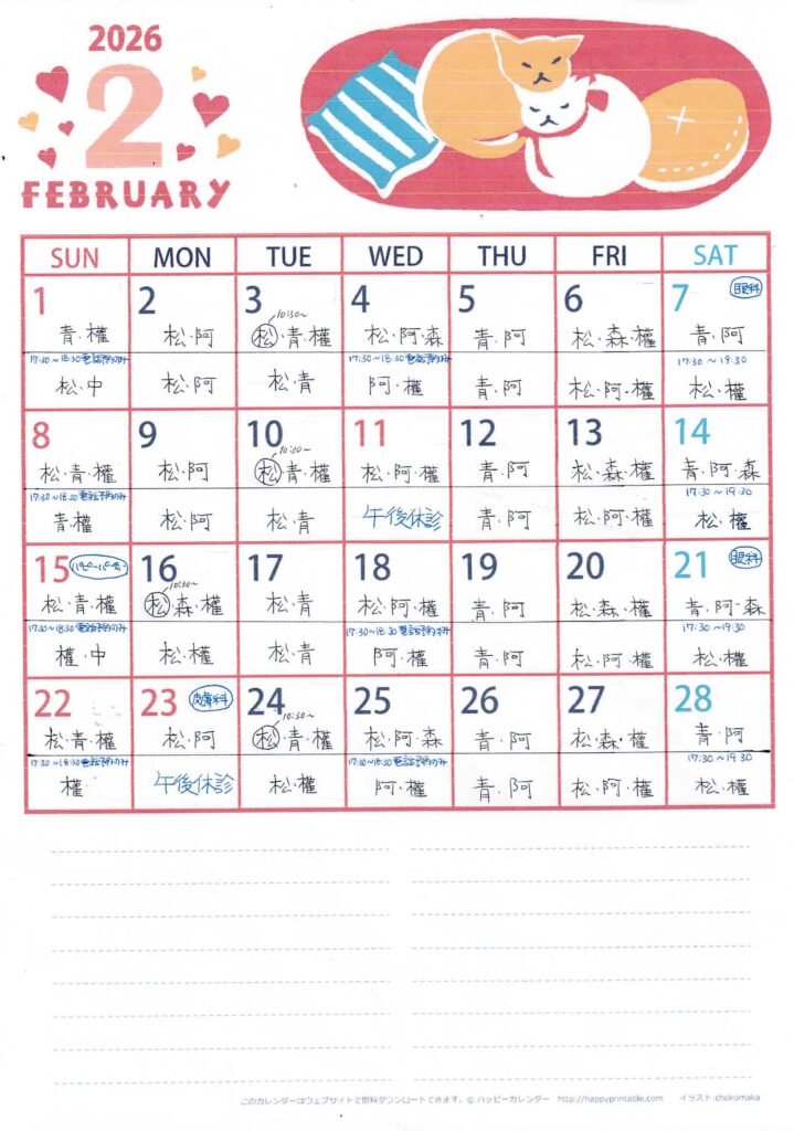 獣医師出勤表(2026年2月)